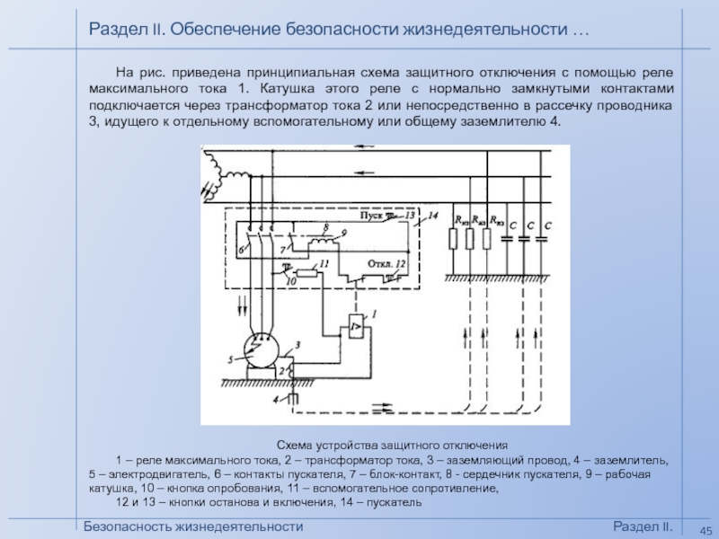 1 – реле максимального тока, 2 – трансформатор тока, 3 – заземляющий провод, 4 – заземлитель, 5 – электродвигатель, 6 – контакты пускателя, 7 – блок-контакт, 8 - сердечник пускателя, 9 – рабочая катушка, 10 – кнопка опробования, 11 – вспомогательное сопротивление,