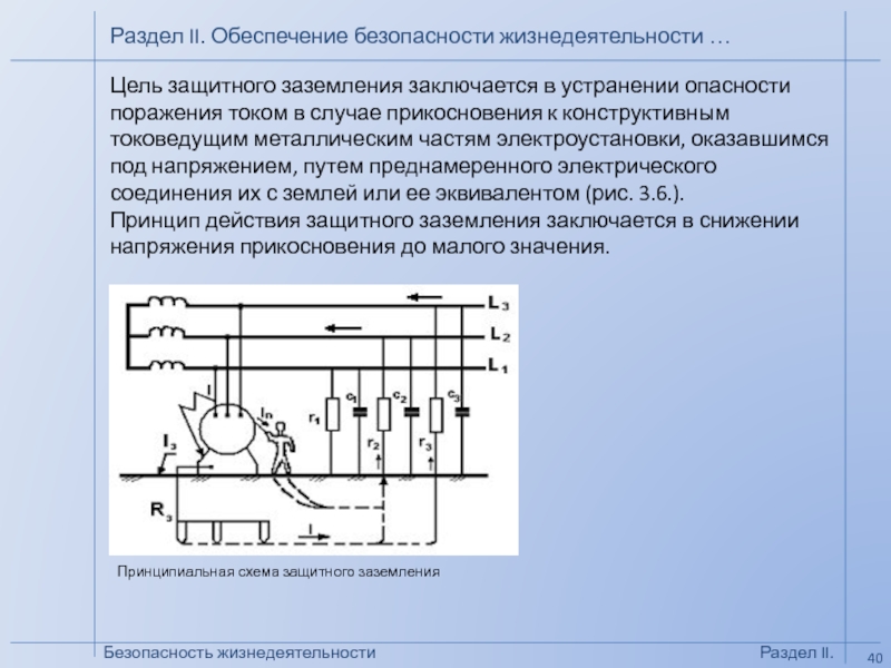 Принцип действия защитного заземления заключается в снижении напряжения прикосновения до малого значения.