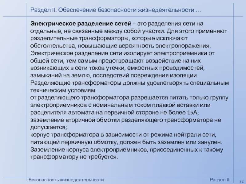 Разделяющие трансформаторы должны удовлетворять специальным техническим условиям:
