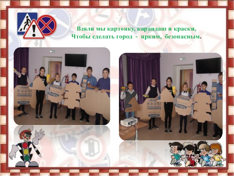 Взяли мы картонку, карандаш и краски,Чтобы сделать город - ярким, безопасным.