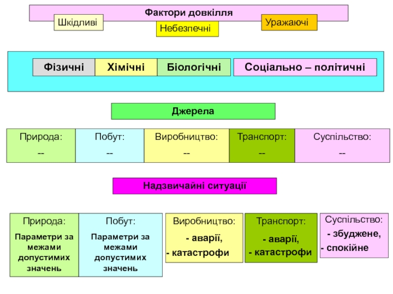 фактори умовно поділяють на шкідливі, небезпечні та уражаючі