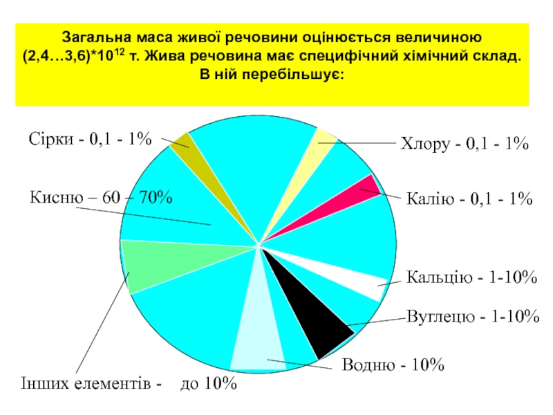 Слайд 10Загальна маса живої речовини оцінюється величиною (2,4…3,6)*1012 т. Жива речовина