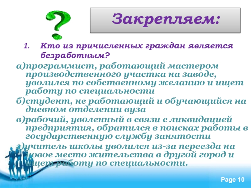 К числу выбывших из состава рабочей силы относятся домохозяйки; лица, отчаявшиеся в поиске работы и другие добровольно незанятые граждане трудоспособного возраста.