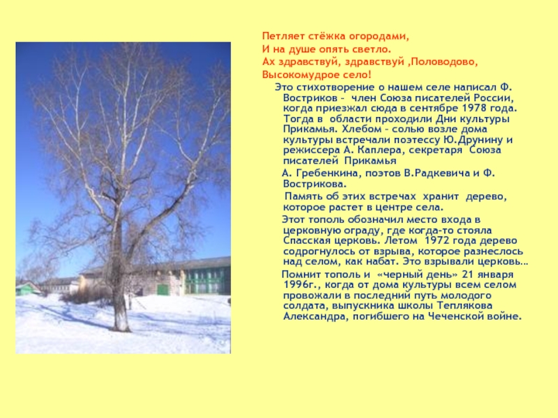 Помнит тополь и «черный день» 21 января 1996г., когда от дома культуры всем селом провожали в последний путь молодого солдата, выпускника школы Теплякова Александра, погибшего на Чеченской войне.