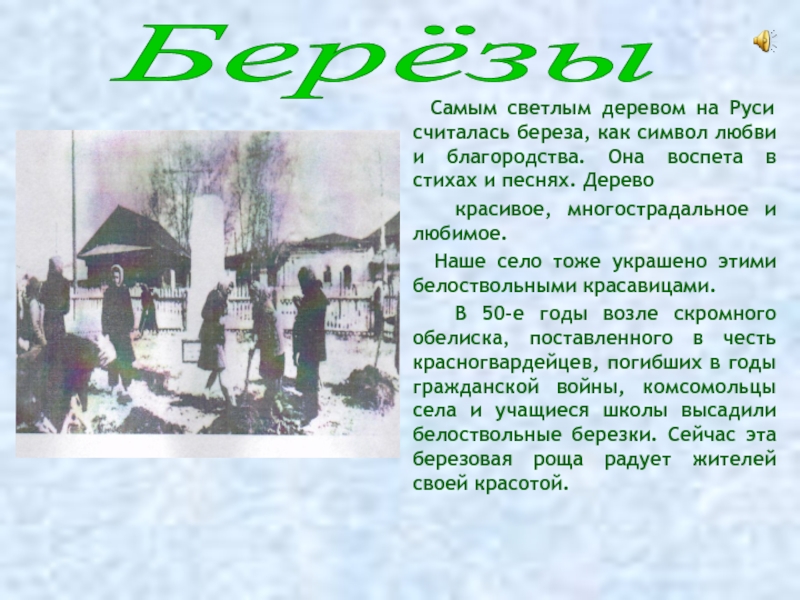 Слайд 12 Самым светлым деревом на Руси считалась береза,
