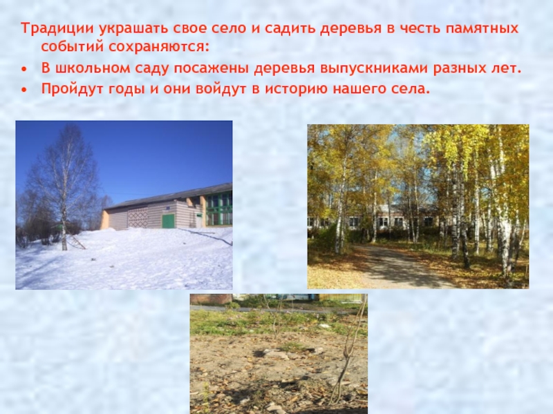 Слайд 22Традиции украшать свое село и садить деревья в честь памятных