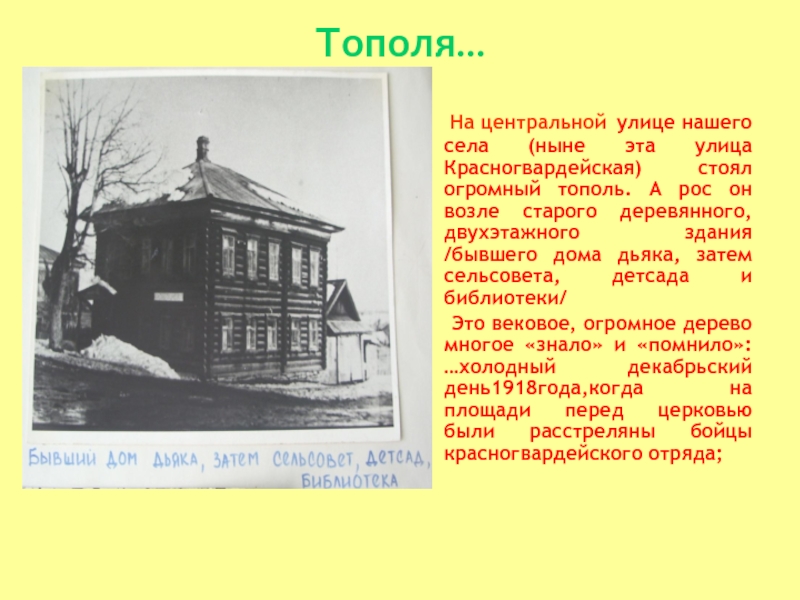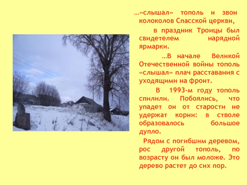 Это вековое, огромное дерево многое «знало» и «помнило»: …холодный декабрьский день1918года,когда на площади перед церковью были расстреляны бойцы красногвардейского отряда;