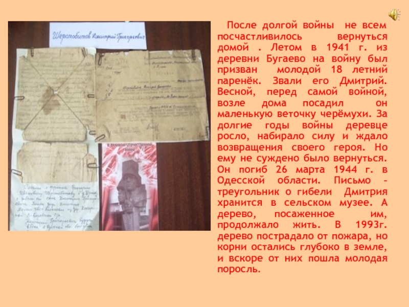 войну был призван молодой 18 летний паренёк. Звали его Дмитрий. Весной, перед самой войной, возле дома посадил он маленькую веточку черёмухи. За долгие годы войны деревце росло, набирало силу и ждало возвращения своего героя. Но ему не суждено было вернуться. Он погиб 26 марта 1944 г. в Одесской области. Письмо – треугольник о гибели Дмитрия хранится в сельском музее. А дерево, посаженное им, продолжало жить. В 1993г. дерево пострадало от пожара, но корни остались глубоко в земле, и вскоре от них пошла молодая поросль.