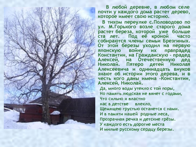 В тихом переулке с.Половодово по ул. М.Горького возле старого дома растет береза, которой уже больше ста лет. Под её кроной часто собираются члены семьи Брезгиных. От этой березы уходил на первую японскую войну их прапрадед Константин, на Гражданскую - прадед Алексей, на Отечественную дед Николай. Пятеро детей Николая Алексеевича и одиннадцать внуков знают об истории этого дерева, и в честь кого даны имена -Константин, Алексей, Николай.
