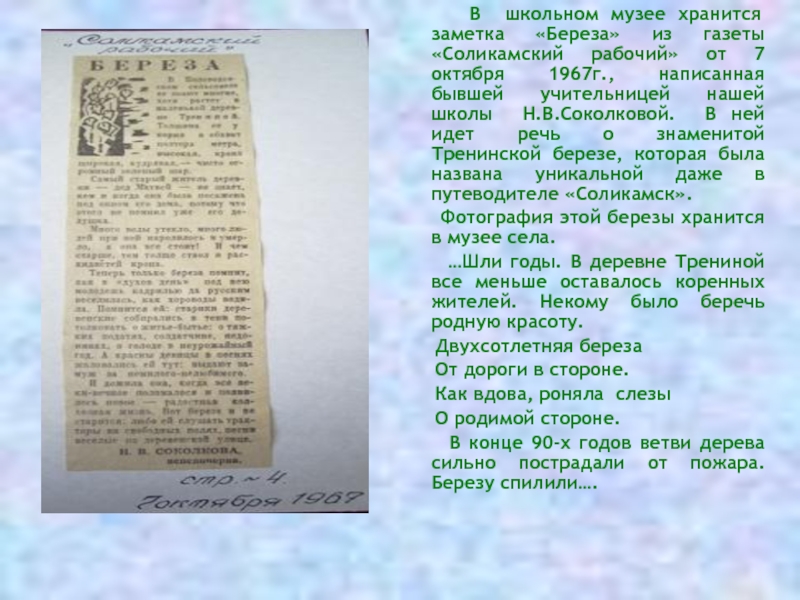 нашей школы Н.В.Соколковой. В ней идет речь о знаменитой Тренинской березе, которая была названа уникальной даже в путеводителе «Соликамск».