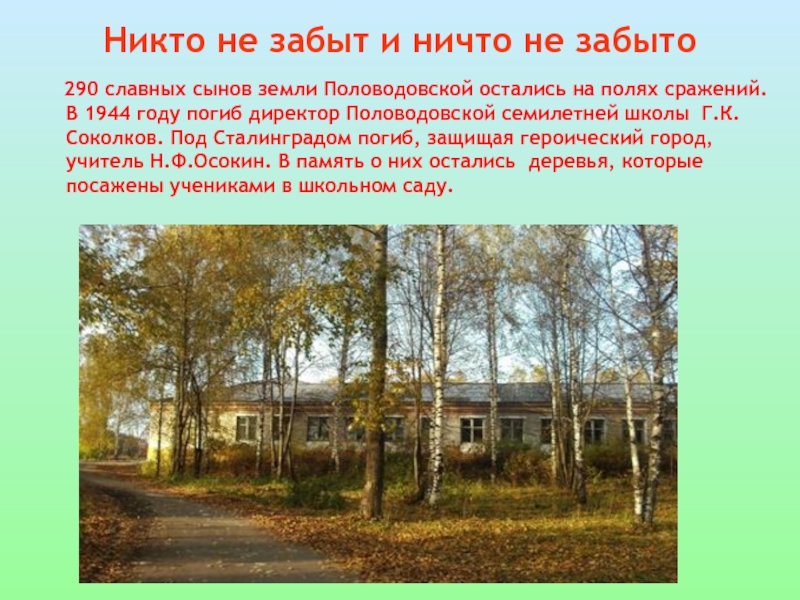 году погиб директор Половодовской семилетней школы Г.К.Соколков. Под Сталинградом погиб, защищая героический город, учитель Н.Ф.Осокин. В память о них остались деревья, которые посажены учениками в школьном саду.