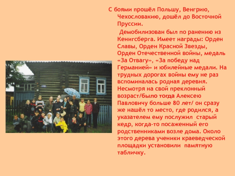 Орден Славы, Орден Красной Звезды, Орден Отечественной войны, медаль «За Отвагу», «За победу над Германией» и юбилейные медали. На трудных дорогах войны ему не раз вспоминалась родная деревня. Несмотря на свой преклонный возраст/было тогда Алексею Павловичу больше 80 лет/ он сразу же нашёл то место, где родился, а указателем ему послужил старый кедр, когда-то посаженный его родственниками возле дома. Около этого дерева ученики краеведческой площадки установили памятную табличку.