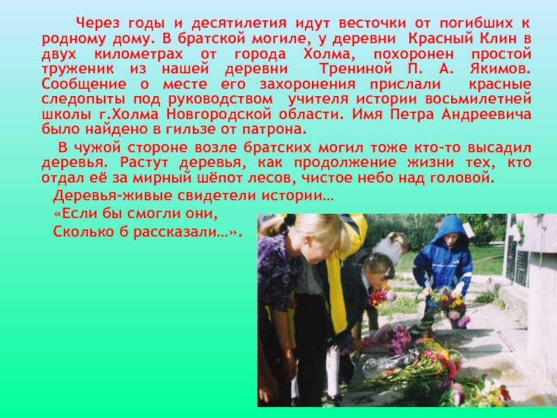 Клин в двух километрах от города Холма, похоронен простой труженик из нашей деревни Трениной П. А. Якимов. Сообщение о месте его захоронения прислали красные следопыты под руководством учителя истории восьмилетней школы г.Холма Новгородской области. Имя Петра Андреевича было найдено в гильзе от патрона.