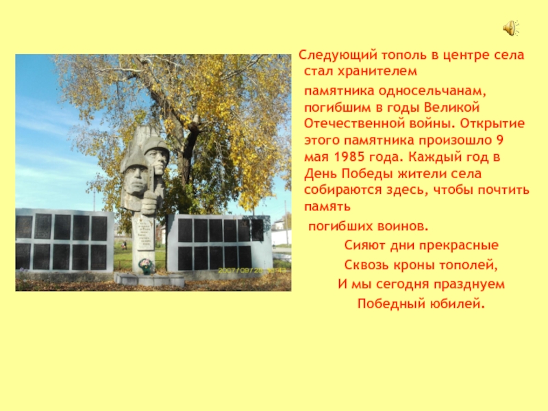 Этот тополь обозначил место входа в церковную ограду, где когда-то стояла Спасская церковь. Летом 1972 года дерево содрогнулось от взрыва, которое разнеслось над селом, как набат. Это взрывали церковь…