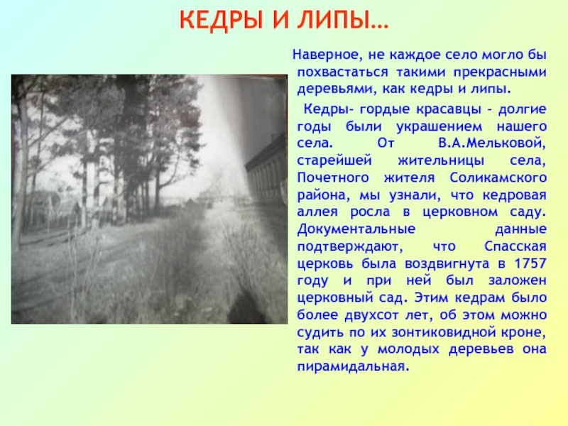 Кедры- гордые красавцы - долгие годы были украшением нашего села. От В.А.Мельковой, старейшей жительницы села, Почетного жителя Соликамского района, мы узнали, что кедровая аллея росла в церковном саду. Документальные данные подтверждают, что Спасская церковь была воздвигнута в 1757 году и при ней был заложен церковный сад. Этим кедрам было более двухсот лет, об этом можно судить по их зонтиковидной кроне, так как у молодых деревьев она пирамидальная.