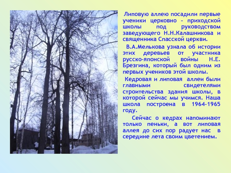 Слайд 11 Липовую аллею посадили первые ученики церковно –