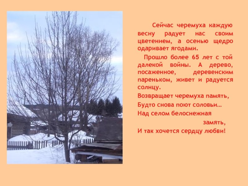 Слайд 18 Сейчас черемуха каждую весну радует нас своим