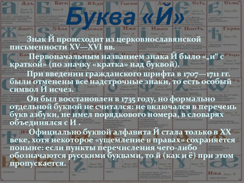 Официально буквой алфавита Й стала только в XX веке, хотя некоторое «ущемление в правах» сохраняется поныне: если пункты перечисления чего-либо обозначаются русскими буквами, то й (как и ё) при этом пропускается.