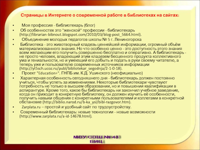 Слайд 10Страницы в Интернете о профессии библиотекаря на сайтах: