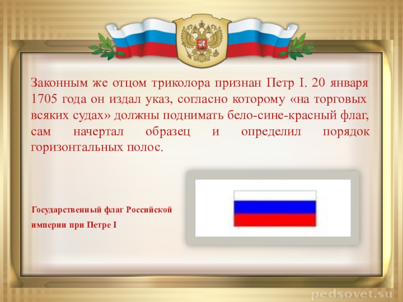 Слайд 8Законным же отцом триколора признан Петр I. 20 января 1705