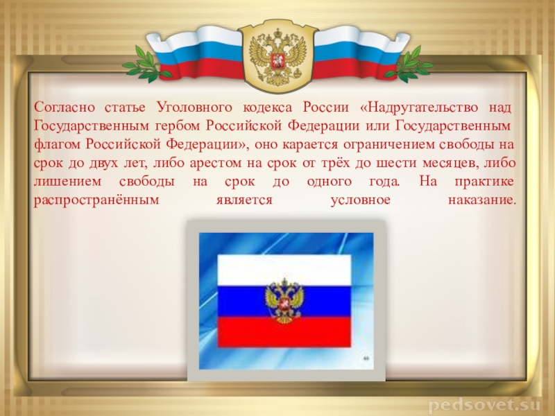 Слайд 16Согласно статье Уголовного кодекса России «Надругательство над Государственным гербом Российской