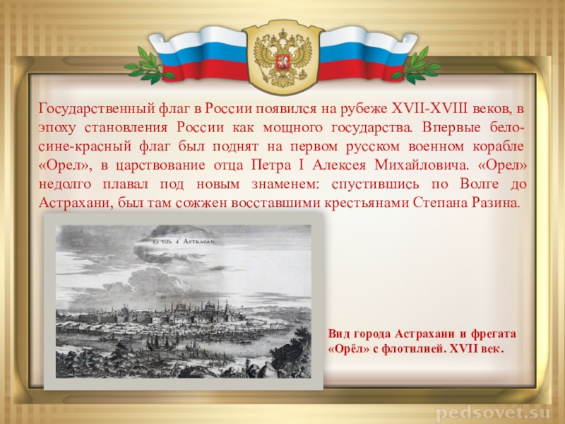 поднят на первом русском военном корабле «Орел», в царствование отца Петра I Алексея Михайловича. «Орел» недолго плавал под новым знаменем: спустившись по Волге до Астрахани, был там сожжен восставшими крестьянами Степана Разина.