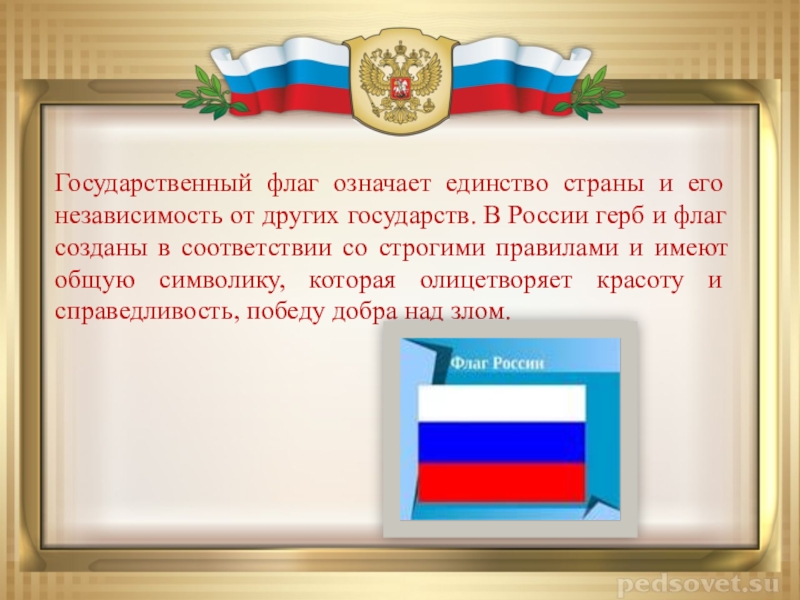Слайд 4Государственный флаг означает единство страны и его независимость от других