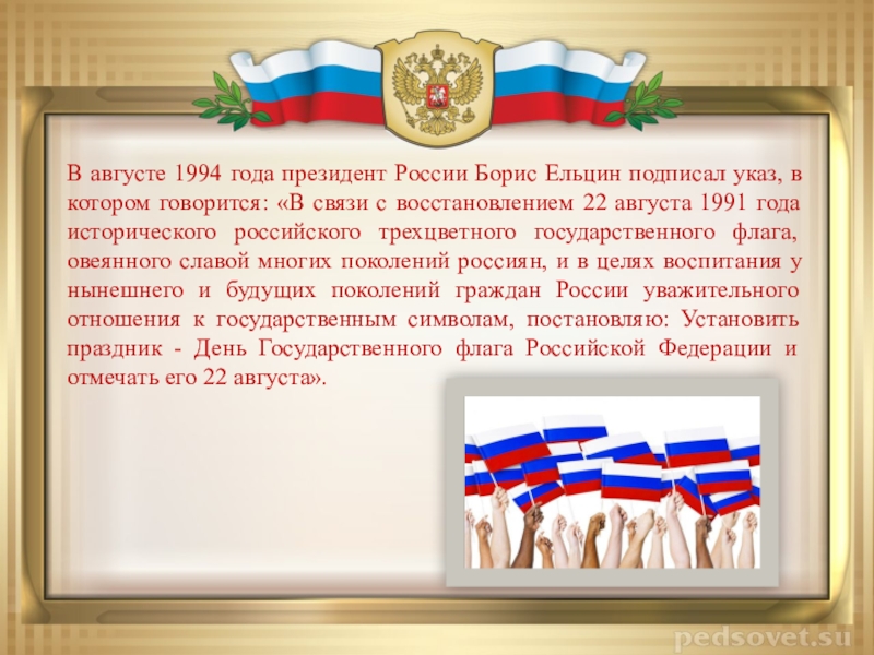года исторического российского трехцветного государственного флага, овеянного славой многих поколений россиян, и в целях воспитания у нынешнего и будущих поколений граждан России уважительного отношения к государственным символам, постановляю: Установить праздник - День Государственного флага Российской Федерации и отмечать его 22 августа».
