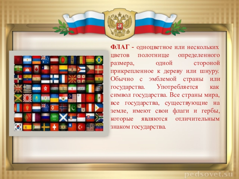 эмблемой страны или государства. Употребляется как символ государства. Все страны мира, все государства, существующие на земле, имеют свои флаги и гербы, которые являются отличительным знаком государства.