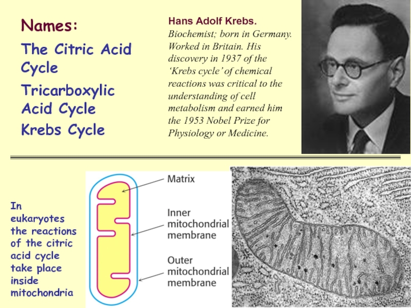 Hans Adolf Krebs. Biochemist; born in Germany. Worked in Britain. His discovery in 1937 of the ‘Krebs cycle’ of chemical reactions was critical to the understanding of cell metabolism and earned him the 1953 Nobel Prize for Physiology or Medicine.