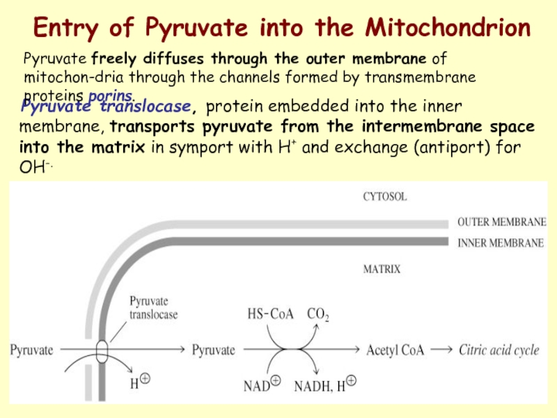 Pyruvate freely diffuses through the outer membrane of mitochon-dria through the channels formed by transmembrane proteins porins.
