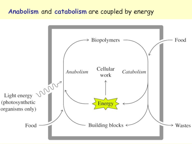 Catabolism and anabolism are tightly linked together by their coordinated energy requirements: catabolic processes release the energy from food and collect it in the ATP; anabolic processes use the free energy stored in ATP to perform work.