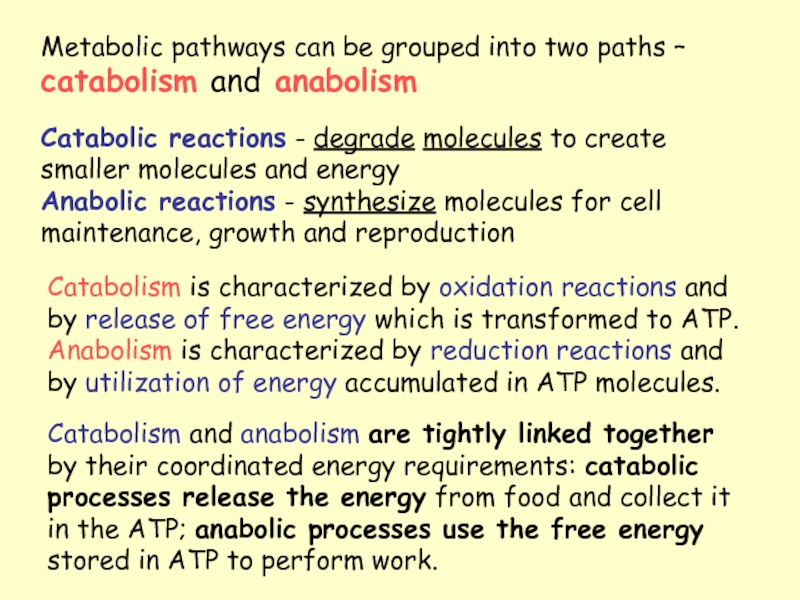 Catabolism is characterized by oxidation reactions and by release of free energy which is transformed to ATP. Anabolism is characterized by reduction reactions and by utilization of energy accumulated in ATP molecules.