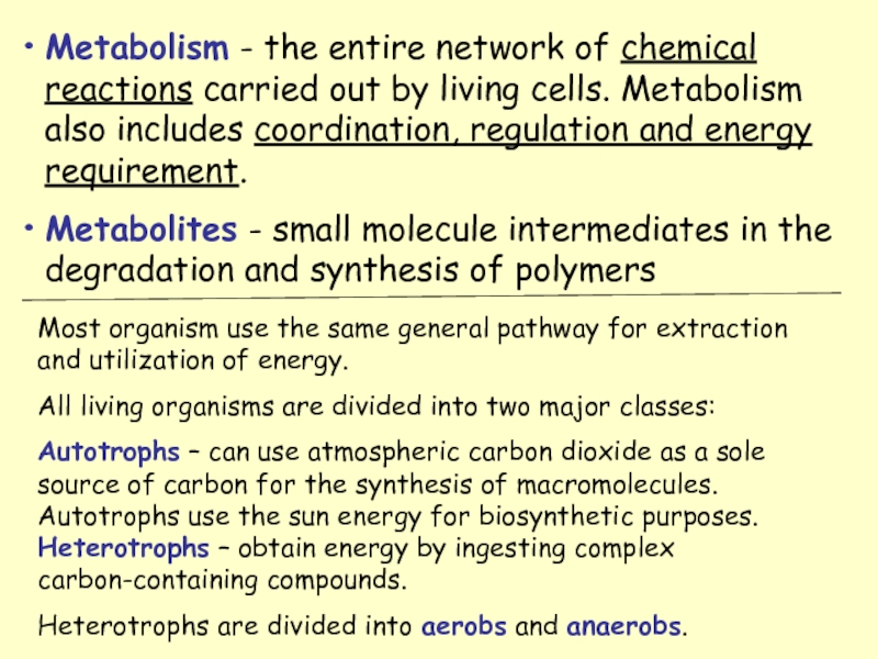 Autotrophs – can use atmospheric carbon dioxide as a sole source of carbon for the synthesis of macromolecules. Autotrophs use the sun energy for biosynthetic purposes. Heterotrophs – obtain energy by ingesting complex carbon-containing compounds.