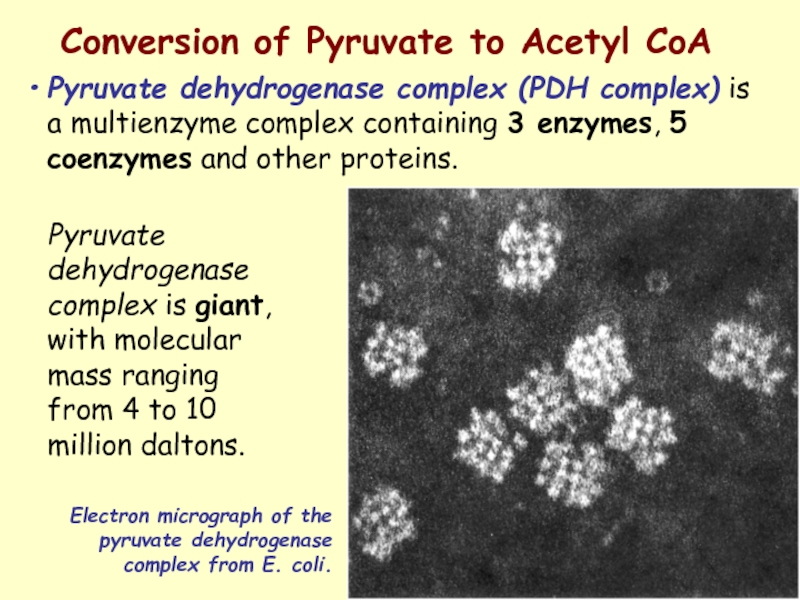 Pyruvate dehydrogenase complex is giant, with molecular mass ranging from 4 to 10 million daltons.