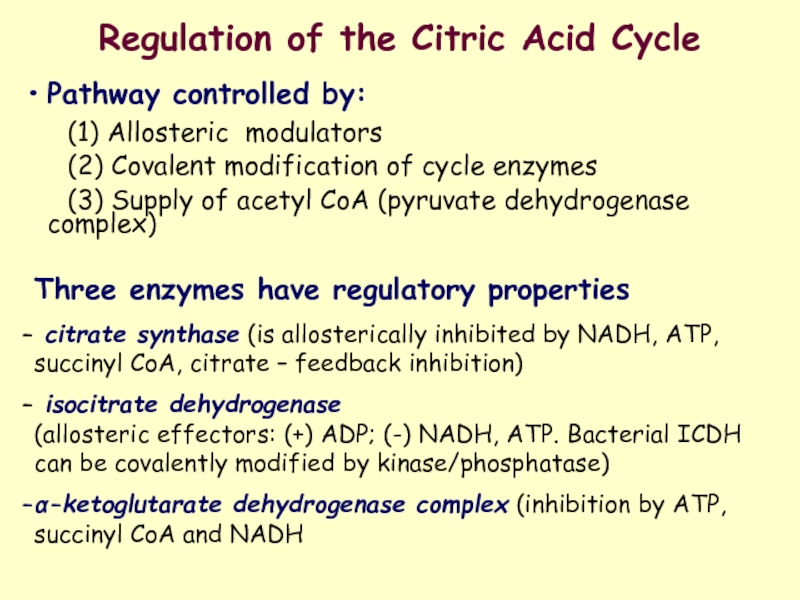 citrate synthase (is allosterically inhibited by NADH, ATP, succinyl CoA, citrate – feedback inhibition)
