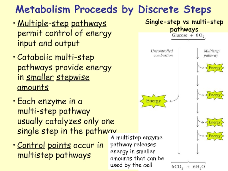 A multistep enzyme pathway releases energy in smaller amounts that can be used by the cell