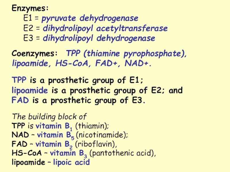 The building block of TPP is vitamin B1 (thiamin); NAD – vitamin B5 (nicotinamide); FAD – vitamin B2 (riboflavin), HS-CoA – vitamin B3 (pantothenic acid), lipoamide – lipoic acid