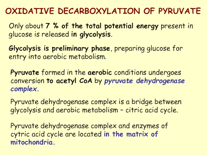 Pyruvate dehydrogenase complex is a bridge between glycolysis and aerobic metabolism – citric acid cycle.