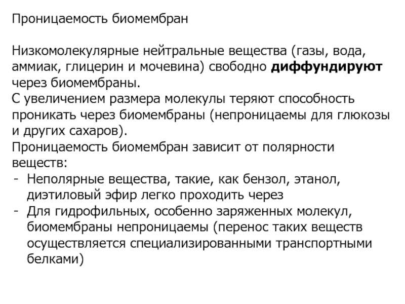 Для гидрофильных, особенно заряженных молекул, биомембраны непроницаемы (перенос таких веществ осуществляется специализированными транспортными белками)