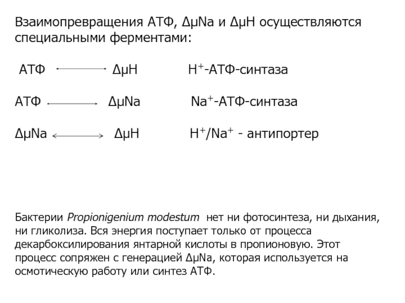 Слайд 25Взаимопревращения АТФ, ΔμNa и ΔμН осуществляются специальными ферментами: