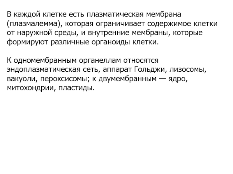 К одномембранным органеллам относятся эндоплазматическая сеть, аппарат Гольджи, лизосомы, вакуоли, пероксисомы; к двумембранным — ядро, митохондрии, пластиды.