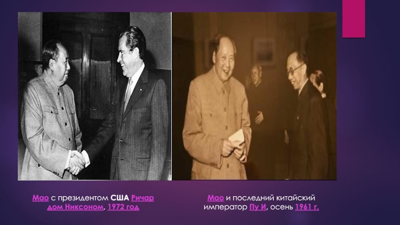 Мао с президентом США Ричардом Никсоном, 1972 годМао и последний китайский император Пу И, осень 1961 г.