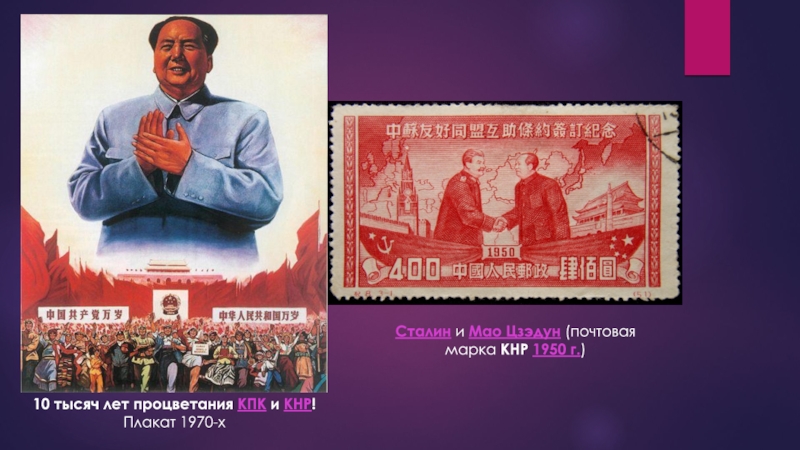 10 тысяч лет процветания КПК и КНР! Плакат 1970-хСталин и Мао Цзэдун (почтовая марка КНР 1950 г.)