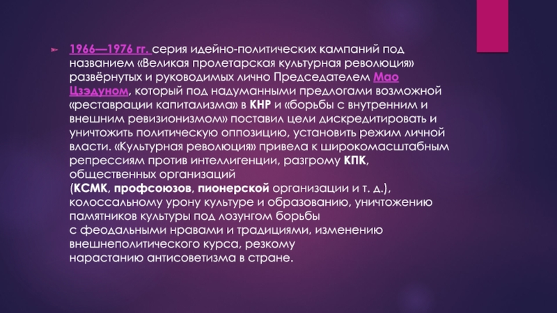 1966—1976 гг. серия идейно-политических кампаний под названием «Великая пролетарская культурная революция» развёрнутых и руководимых лично Председателем Мао Цзэдуном,