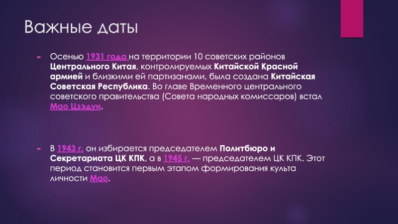 В 1943 г. он избирается председателем Политбюро и Секретариата ЦК КПК, а в 1945 г. — председателем ЦК КПК. Этот период становится первым этапом формирования культа личности Мао.