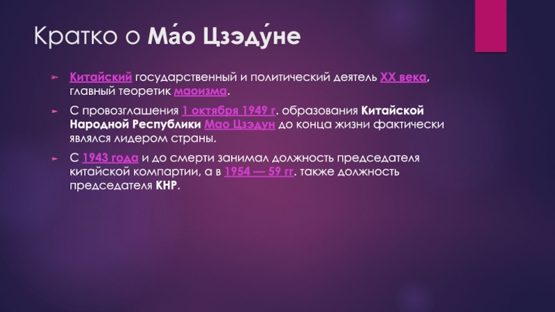 Кратко о Ма́о Цзэду́неКитайский государственный и политический деятель XX века, главный теоретик маоизма.С провозглашения 1 октября 1949 г. образования Китайской Народной