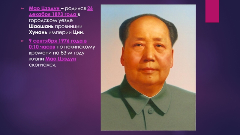 Мао Цзэдун – родился 26 декабря 1893 года в городском уезде Шаошань провинции Хунань империи Цин. 9 сентября 1976 года в 0:10 часов по пекинскому времени на 83-м году жизни Мао Цзэдун скончался.