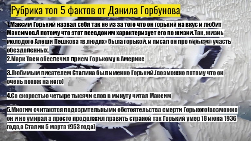 Рубрика топ 5 фактов от Данила Горбунова1.Максим Горький назвал себя так не из за того что он
