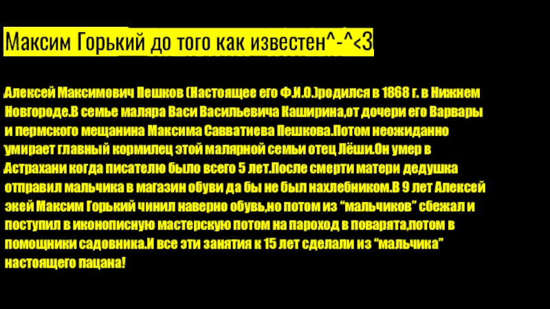 Васильевича Каширина,от дочери его Варвары и пермского мещанина Максима Савватиева Пешкова.Потом неожиданно умирает главный кормилец этой малярной семьи отец Лёши.Он умер в Астрахани когда писателю было всего 5 лет.После смерти матери дедушка отправил мальчика в магазин обуви да бы не был нахлебником.В 9 лет Алексей экей Максим Горький чинил наверно обувь,но потом из “мальчиков” сбежал и поступил в иконописную мастерскую потом на пароход в поварята,потом в помощники садовника.И все эти занятия к 15 лет сделали из “мальчика” настоящего пацана!